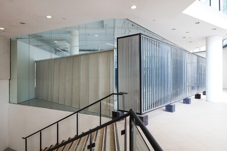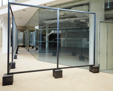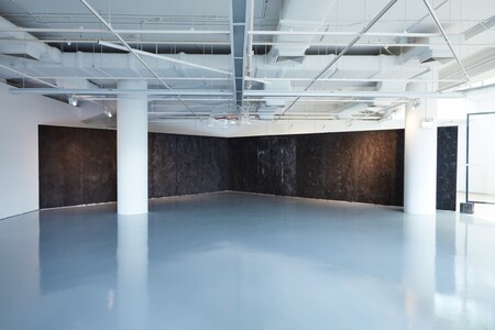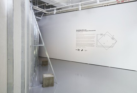 The installation is most simply described as one space superimposed upon another. The artist introduces four new walls that intersect the Earl Lu Gallery, appearing to slip in and out of its existing perimeter. This new rectangle is not uniform along its length. As a spatial enclosure, it varies from skeletal metal framing to a solid surface coated in dark concrete render. Widjaja’s four walls counter the free-form geometry of the existing gallery plan—which he finds ‘disorienting’ and ‘insubstantial’—with a sober, rectilinear form. The position of the hut is carefully rationalized, distributed around a notional centre point that is equidistant from three existing columns. At this centre point is a parabolic speaker, which plays a sound piece created for the work.