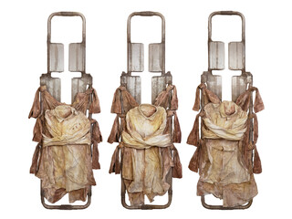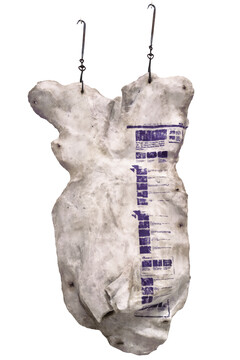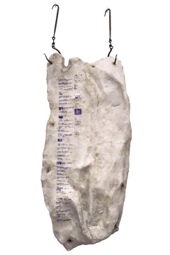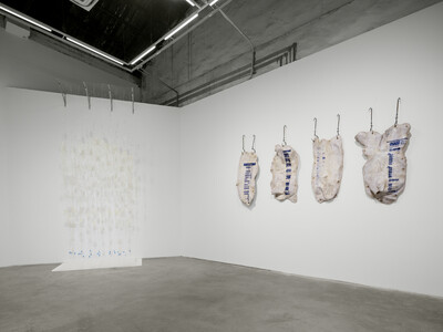 In the materials and visual language employed in her works, Lu Yu constructs two intuitive pathways: the instinctual intuition of the human as a biological being, and the constructed intuition of the human as a social being. The biological intuition is grounded in genetic mechanisms of seeking benefit and avoiding harm. Visual elements such as festering skin, sutured wounds, and slaughtered animal bodies trigger primal responses of aversion. Meanwhile, the social intuition arises from past experience and cultural adaptation: the appearance of elements such as red envelopes, lottery tickets, or burning incense is immediately intelligible, even outside of any textual context. Within the artworks, these two intuitive pathways intersect, using explicit visual language to render abstract concepts in forms that evoke unease. The exhibition’s title piece, Living a Life Safely in Fear, serves as a summative reflection on the internalization of discipline. The life of an individual living within the confines of prescribed norms is quantified into countless nodes that can be evaluated as right or wrong. Inscribed on over three hundred fragments of skin and each marked with a red check, these symbols signify achievement and compliance within the socially constructed intuition, while simultaneously registering, through biological instinct, as wounds scorch into the flesh.