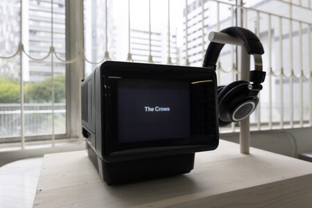SD video, mini CRT television, headphones, pine wood
