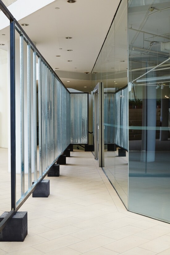 The installation is most simply described as one space superimposed upon another. The artist introduces four new walls that intersect the Earl Lu Gallery, appearing to slip in and out of its existing perimeter. This new rectangle is not uniform along its length. As a spatial enclosure, it varies from skeletal metal framing to a solid surface coated in dark concrete render. Widjaja’s four walls counter the free-form geometry of the existing gallery plan—which he finds ‘disorienting’ and ‘insubstantial’—with a sober, rectilinear form. The position of the hut is carefully rationalized, distributed around a notional centre point that is equidistant from three existing columns. At this centre point is a parabolic speaker, which plays a sound piece created for the work.