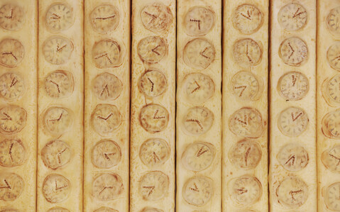 Because these timetables are constructed rather than natural, many of the configurations of hour and minute hands on the clock faces could never exist in reality, thereby suggesting the notions of time as both “idling” and “fiction.”