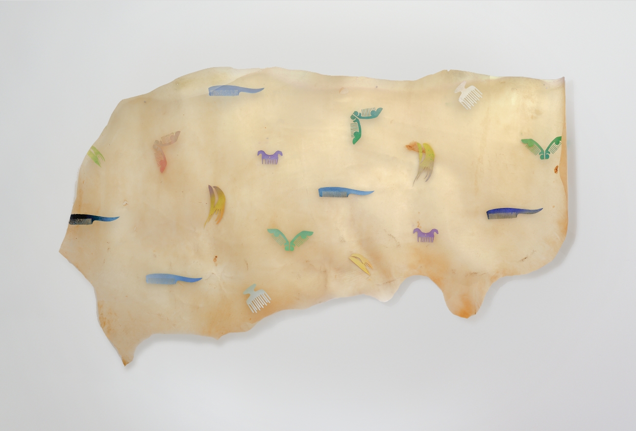 Cowhide, acrylic spray paint, mineral pigments, animal glue